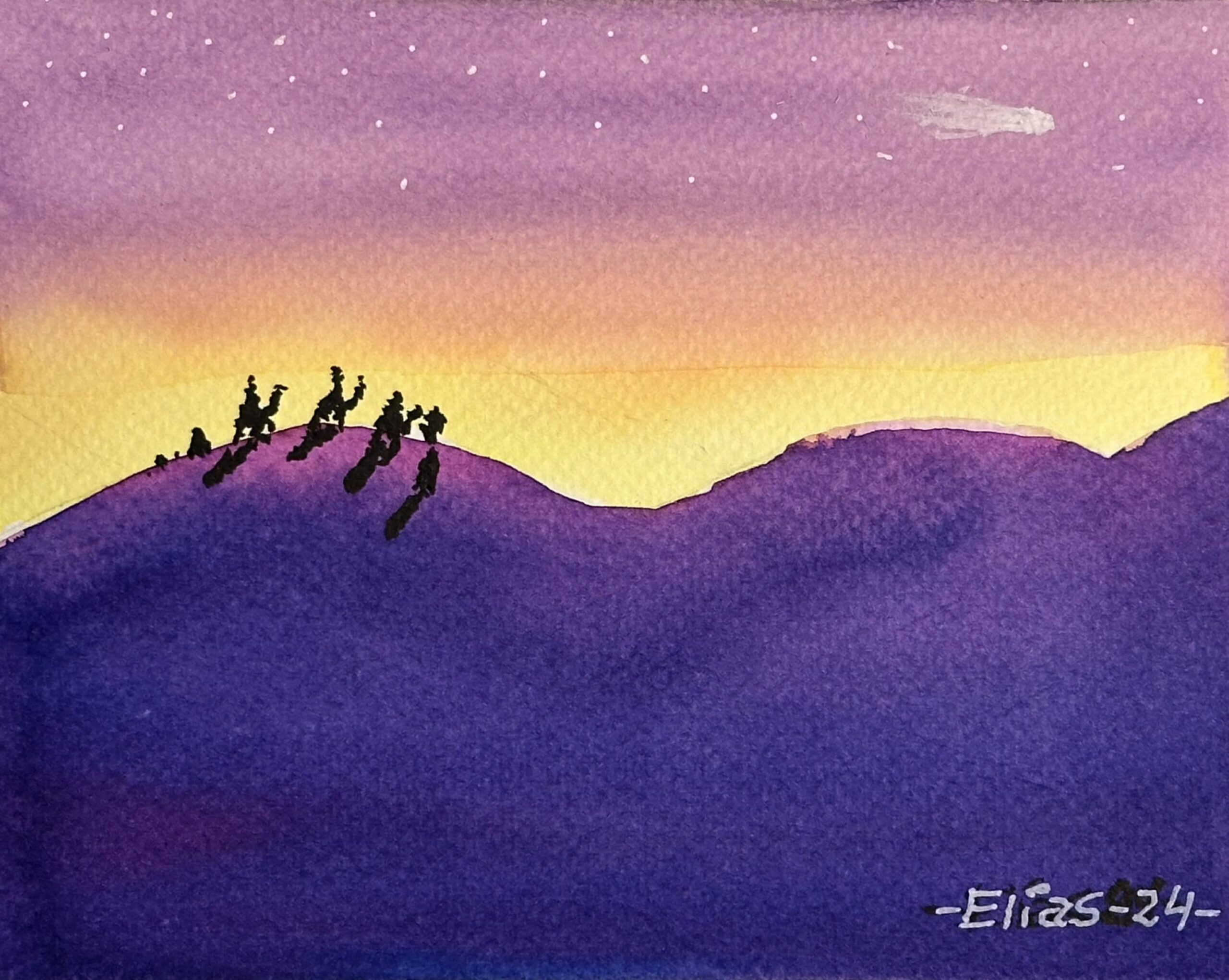 Amanecer. Es la undécima Felicitación de Navidad que dibujo dentro de la serie anual de postales navideñas que llevo a cabo desde 2014. En 2024 amaneció tras un largo periodo de oscuridad.