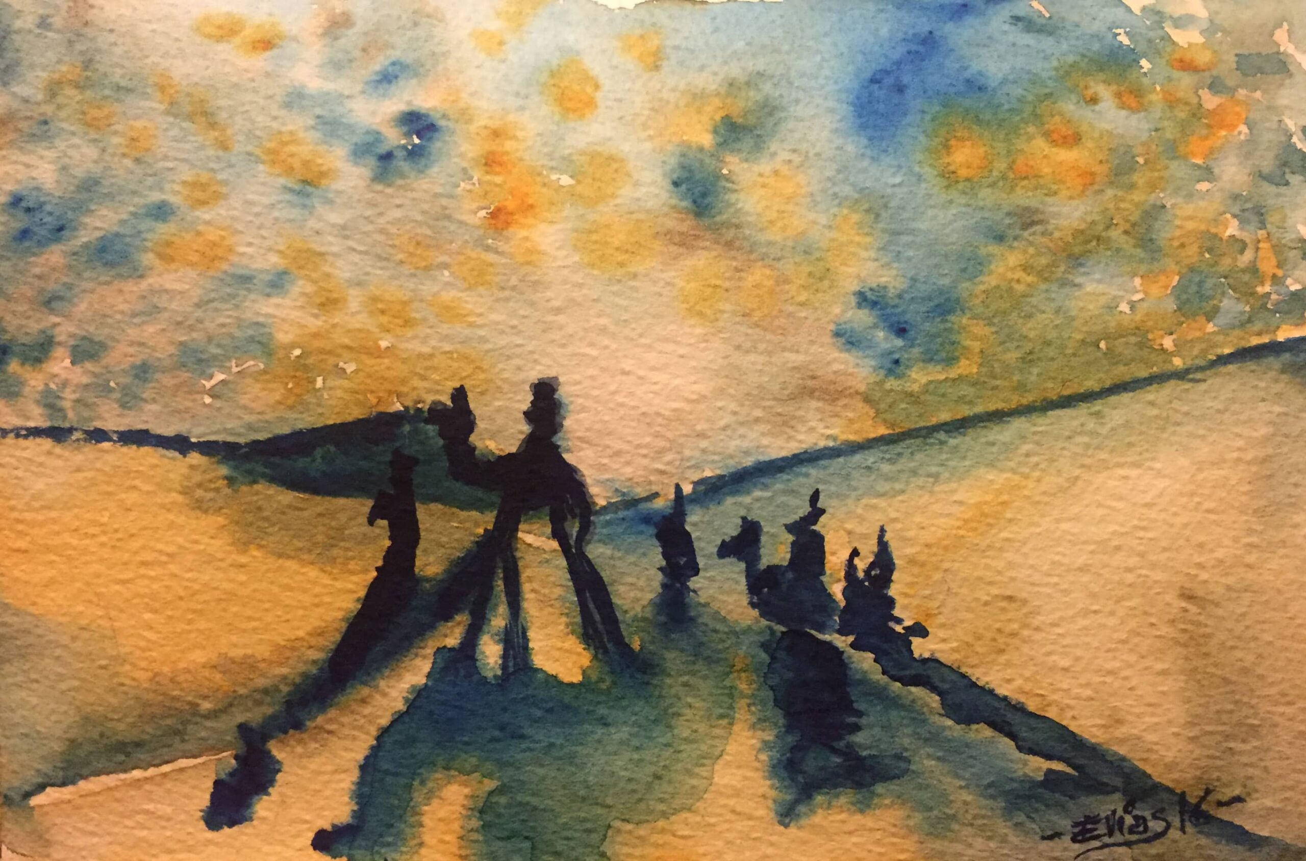 ¡Dejando volar la imaginación! es la tercera Felicitación de Navidad dentro de esta serie de carácter anual. En esta ocasión los Magos están cruzando el desierto durante el atardecer de un día con el cielo aborregado… ¿Les impedirá esto seguir su estrella? Seguro que no.