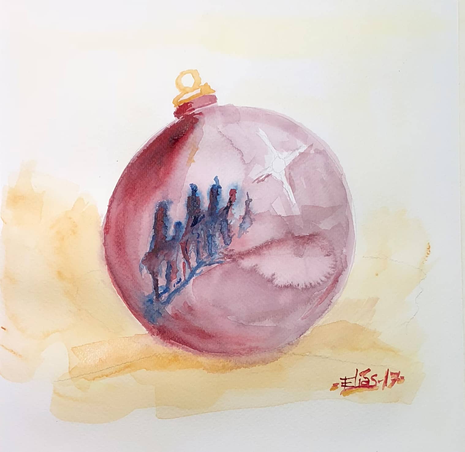 La bola olvidada. Es la cuarta Felicitación de Navidad que he realizado. Representa nuevamente a los Reyes Magos en su camino a Belén, pero en esta ocasión tanto ellos como su estrella guía los percibimos reflejados en una bola que se les ha caído de sus alforjas… se alejan… ¿No nos habremos portado suficientemente bien?… no sé…