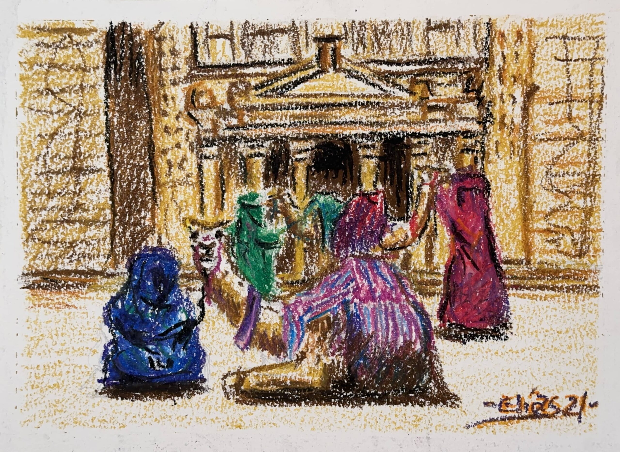 La parada. Es la octava Felicitación de Navidad dentro de la serie anual de postales navideñas que llevo a cabo desde 2014. En esta postal navideña vemos a los Magos detenidos junto a Petra, lo sé seguramente esto nunca ocurrió, pero con los años he descubierto cierta suerte de autoanálisis en esta serie anual. Repaso el año y el subconsciente lanza mensajes que solo con el tiempo se entienden, este año, susurra Para, Reflexiona.